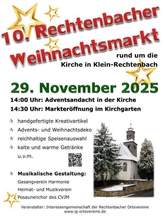 Wir laden herzlich ein zu unserem 10. Weihnachtsmarkt am 29.11.2025 rund um die Kirche in Klein-Rechtenbach (Dorfstraße).
